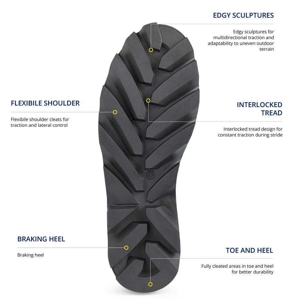 This outsole is the exclusive result of highly customized, solutions conceived matching and choosing the right compound, design and sculpture engineered for this specific fit for use.